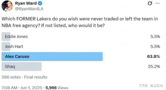 雷速體育6月2日訊 據(jù)湖人記者Ryan Ward更新動態(tài)進行小調(diào)查:“在NBA自由市場中,你希望哪些前湖人球員從未被交易或離開球隊?”由數(shù)據(jù)結(jié)果顯示,卡魯索以63.8%的比率勝出,奧尼爾第